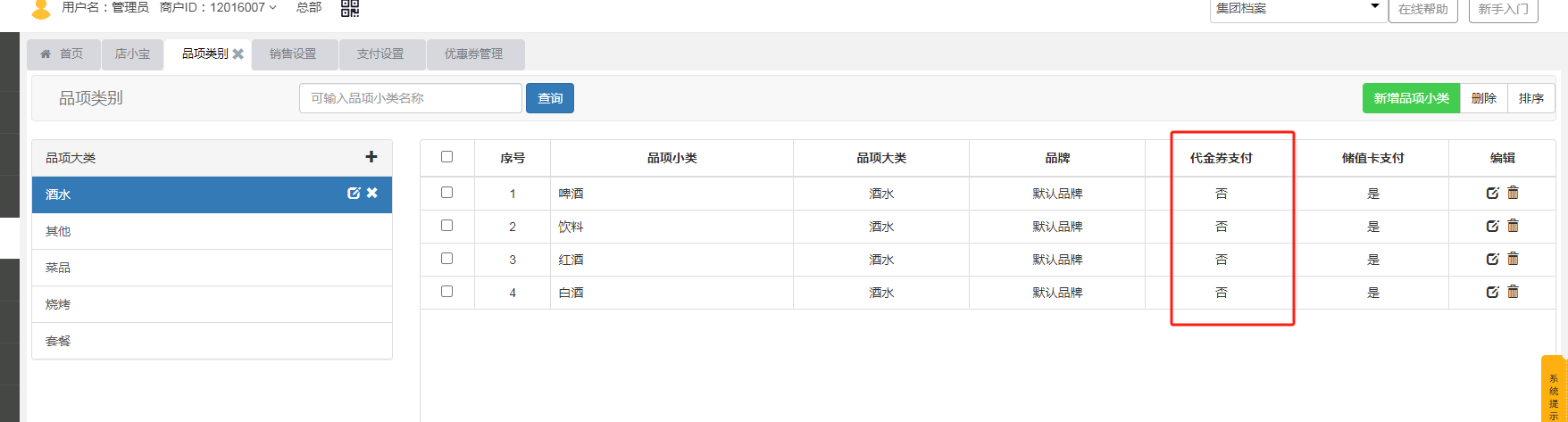 品项小类中,关闭了代金券支付,但是结账的时候还是可以选择代金券支付,是什么原因?
