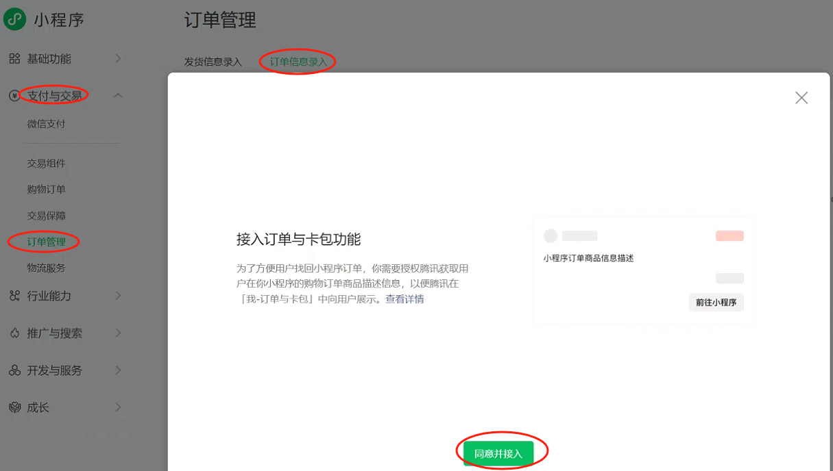 商家登录小程序后台–点击「支付与交易」–「订单管理」–「订单信息录入」,操作“同意并接入”。